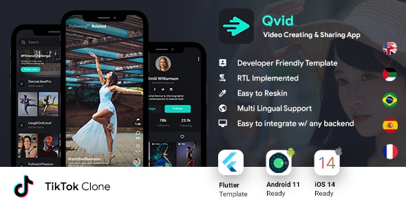 Tik Tok clone app template. Qvid is a social media video app for creating and sharing quick short personal, musical, comedy, and talent videos. Qvid App can be a great choice. It is a modern-based and easily customizable App template. Qvid is a social media video app for creating and sharing video, it’s also known as an online video app.